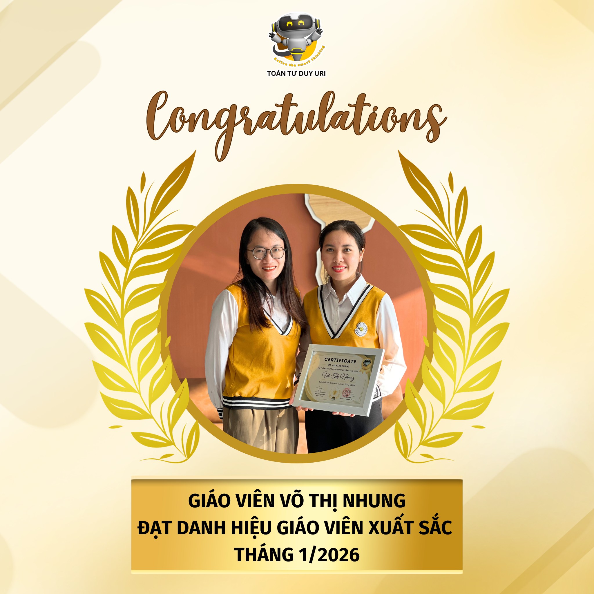 Tháng 1 và tháng 2 này, Hệ thống Toán Tư Duy URI vô cùng vui mừng khi có rất nhiều giáo viên xuất sắc được vinh danh. Điều đó không chỉ thể hiện sự cố gắng của từng thầy cô, mà còn là minh chứng cho một tập thể giáo viên tận tâm, chuyên môn vững vàng và luôn nỗ lực vì sự tiến bộ của học sinh.