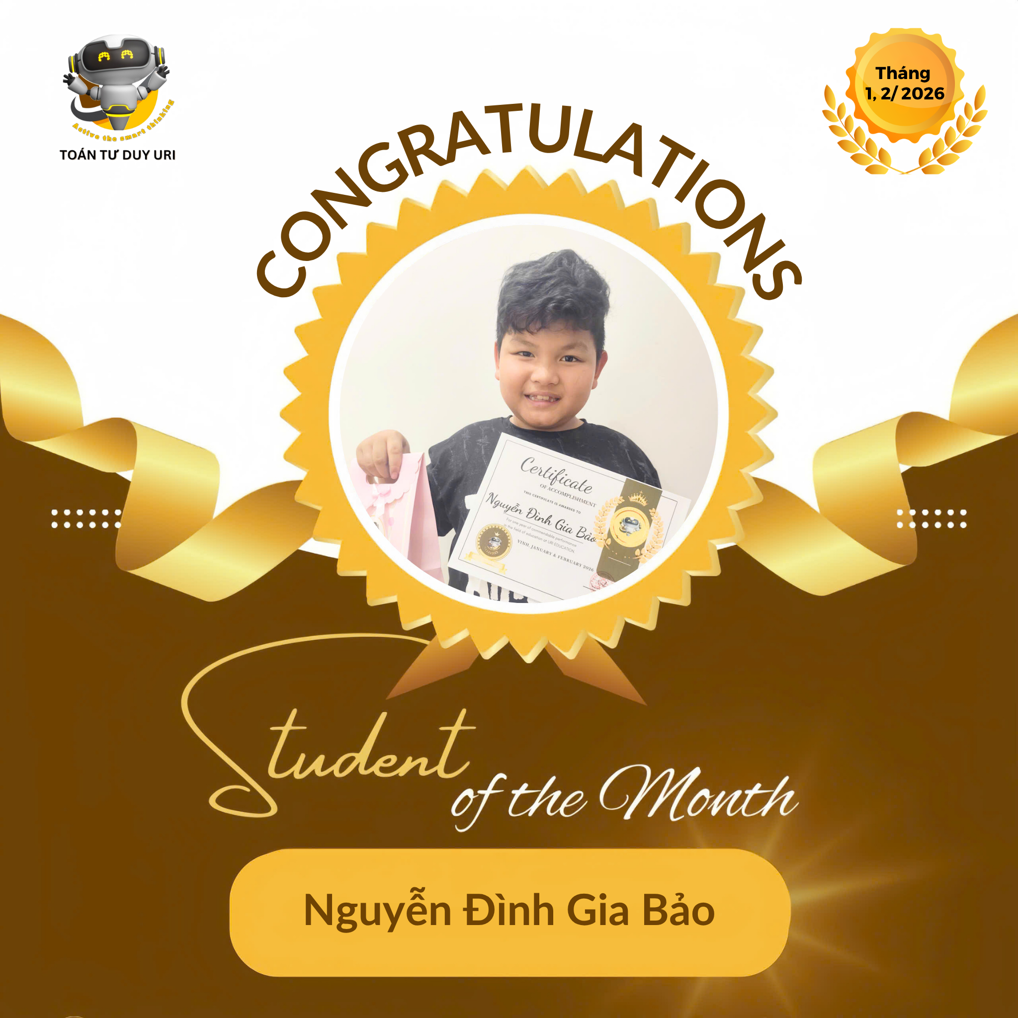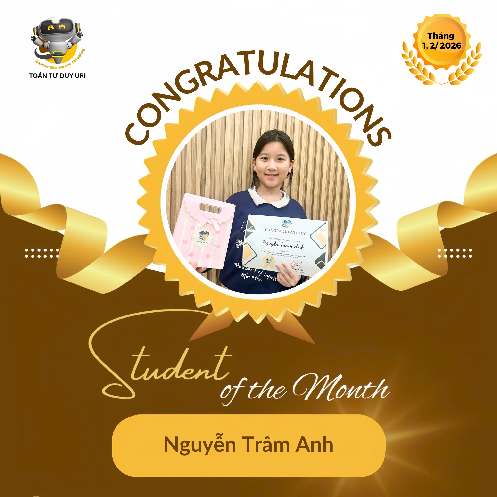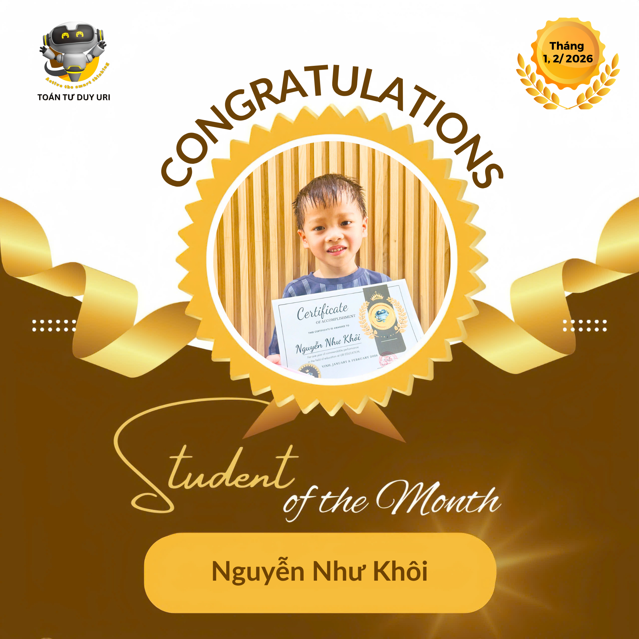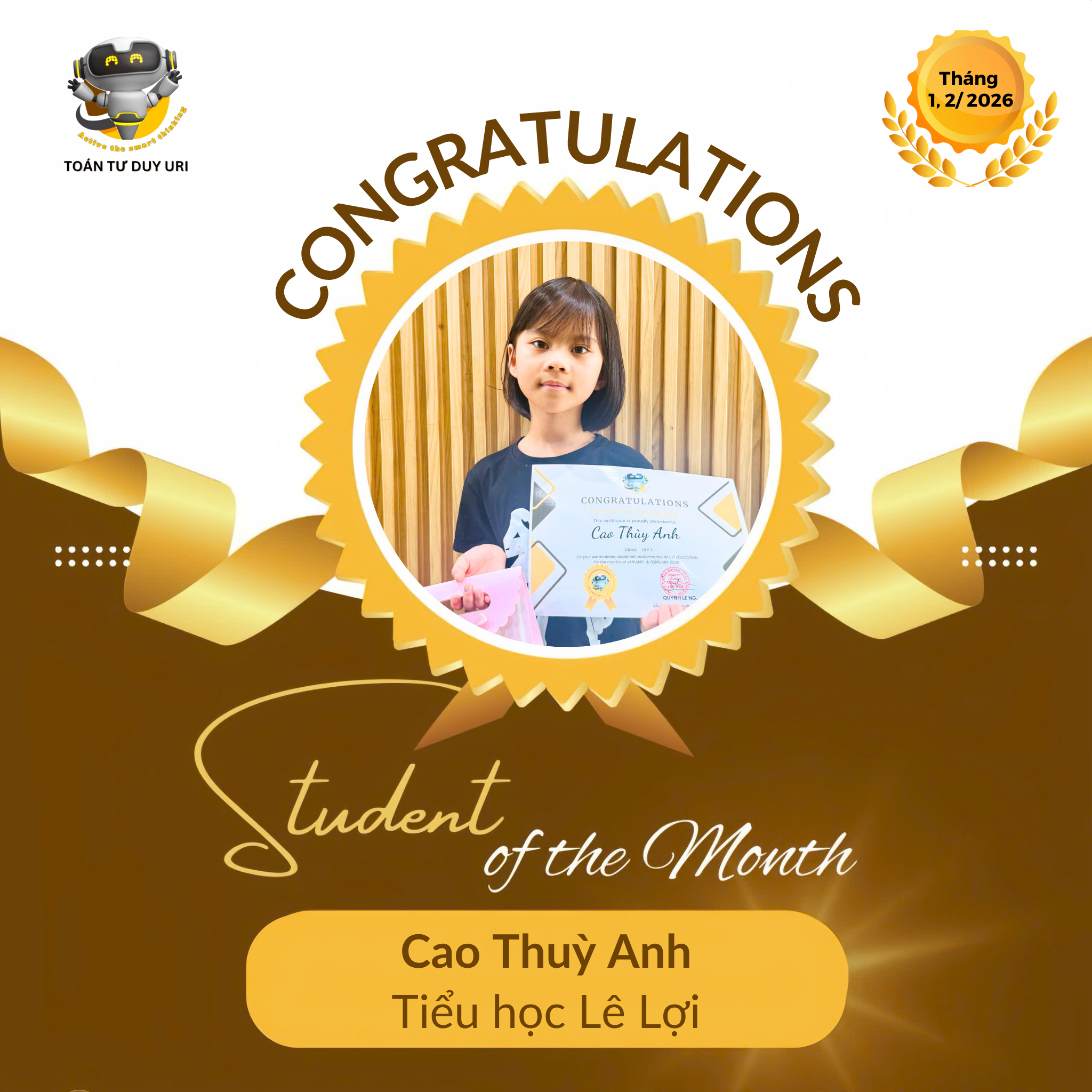 Hệ thống Toán Tư Duy URI mong niềm vui nho nhỏ này sẽ động viên các bạn nhỏ tiếp tục phát huy và đạt được kết quả tốt hơn nữa.
